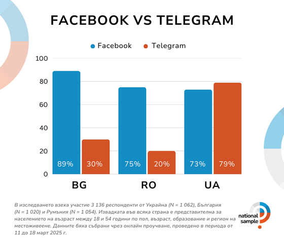 Петте най-използвани мрежи в Румъния и България са Facebook, YouTube, Instagram, TikTok и Telegram. Въпреки че делът на потребителите се различава между двете държави, класацията на тези платформи остава непроменена. За разлика от тях, Украйна показва различен модел, където Telegram ясно се откроява като водещата социална мрежа, отразявайки уникално потребителско поведение в сравнение със съседите си.